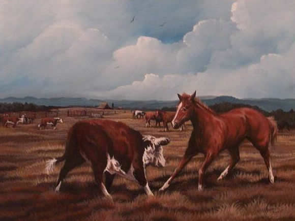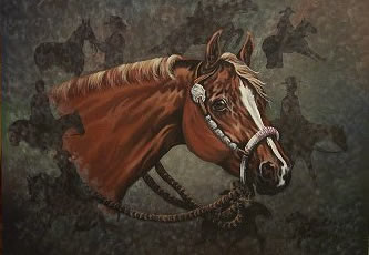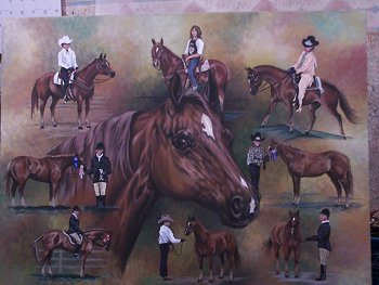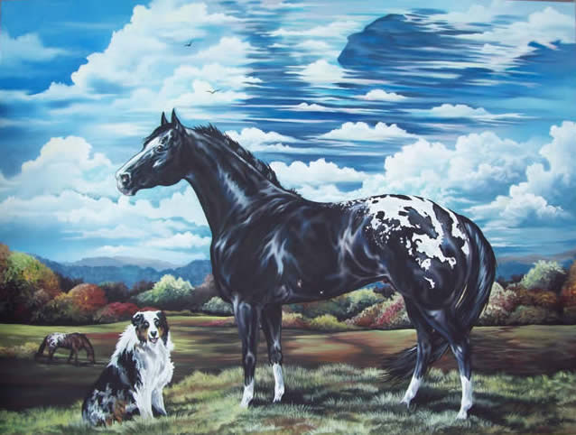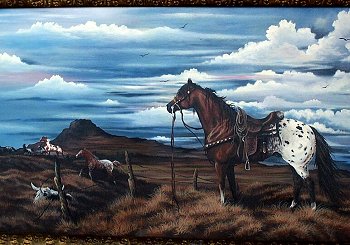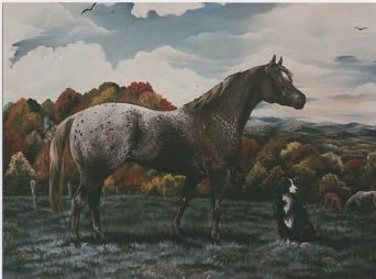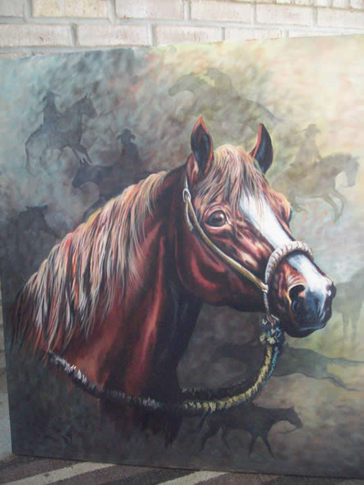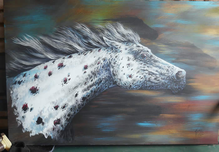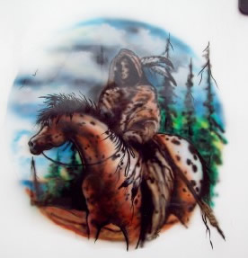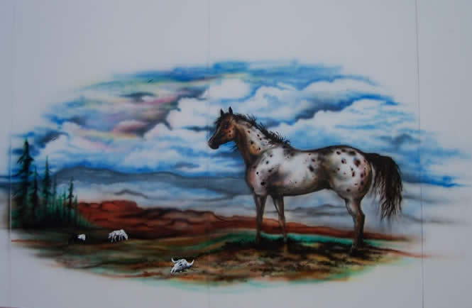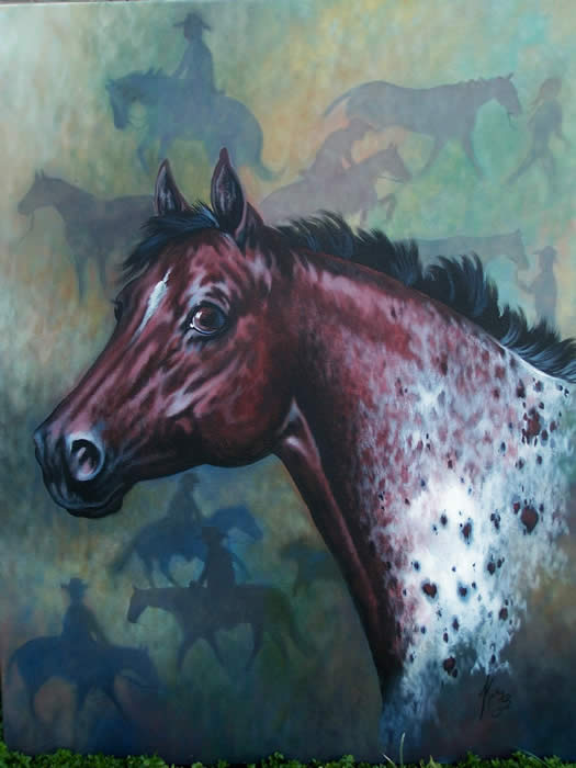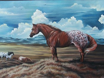 Welcome to my Artwork!!! I'm a self taught artist, working mainly in Acrylic on stretched canvas, However I sometimes paint on clothing and I'm trying to learn to air brush on metal as well. Most of my artwork is centered on the horse. I Love all breeds but my real passion is the Appaloosa, I was drawn to their coloring and the heritage behind them when I was still just a child. I had a mom that was very talented and could draw anything, she was my mentor and critic, she made me who I am today because she told me when my art was lacking and when it was right. An artist has a desire to create something that shows a small part of their inner self, their passion for the subject they paint. I was born with the love of the horse, I've studied them all my life in drawings and then with paint. I do commissioned work from photographs, I've painted many different breeds, and hopefully I've created art that will long outlast me, and be enjoyed and displayed. My only art training came in high school, and from my mom, the rest has been by trial and error. I hope you enjoy this page, Most all these paintings have homes, a couple hang in my own home. My hope for the future is to create a page with paintings for sale, as I can get some completed. My husband and I have no children, but we have 11 horses, Five dogs, three cats and we both work full time, So we have a pretty busy life and a full one. Below is a price listing of paintings on Canvas by commission. Feel free to contact me about my artwork or the appaloosa, Both are a huge part of the person that I am. I hope you enjoy this page, I'm very proud of what I've accomplished and I have so much more to learn. I don't know if any artist is ever fully satisfied with their work, but I strive to become better with each and every painting I do. |