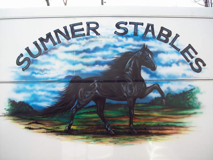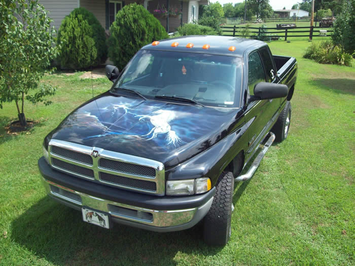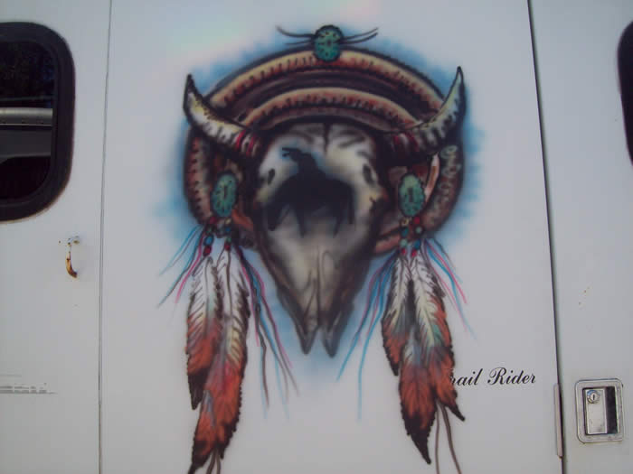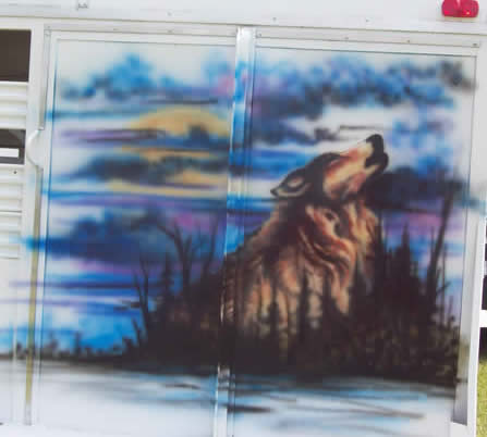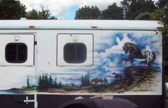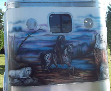 | Below is an example of my first try at airbrush! I have done two other trailers since. I just love doing this!! I know I need to perfect this medium, and I'll continue to work at it. Still I think my first try really wasn't all that bad, I've had alot of favorable comments on it thus far. I'll be adding to this section as I get to do more photos! |