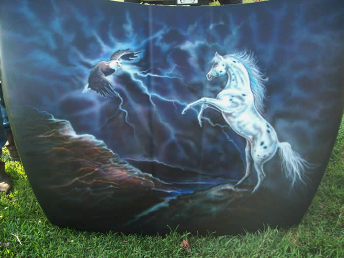 Clothing: Jackets 35.00 if you provide jacket T shirts 25.00 if you provide Shirt Murals With this type of artwork, I reserve the right to see the space first before giving a quote. Same thing for airbrushing and I don't clear coat at this time. That is the responsibility of the owner. Should we in the future do that, I will notify anyone inquiring. |