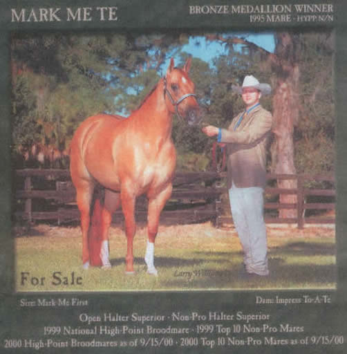 Mark Me Te Red Dun Mare Reg # CN 540975 We welcome this impressive mare to our broodmare band, extensively shown for the first four years of her life, this mare boasts 134 open points in halter, 121 points in Non Pro Halter, she's a Bronze Medallion winner and was 1999 High Point Halter Mare. She also Has her superior in halter as well. We purchased this mare from the breeding program of Ronnie Stinson and she was bred to his stallion when we purchased her. She produced a colored Dun filly with spots on her hips that we intend to keep for our breeding program. We're honored to own this beautiful mare and are excited to get some nice foals from her in the future. Huge build, 16 hands and heavily muscled. HYPP NN Mark Me Te has been retired...