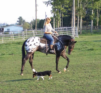 | Bo and I trail riding, early fall of 2009 | Our newest addition! This is Rocky, he's the ruler of the house, we love this breed of dog and we're enjoying having a puppy! The girls Hide from him, he plays too rough! But he's so Smart. | Abby, very pregnant, due to foal in January, she's huge and I so hope it has spots, it should be a show foal deluxe! |