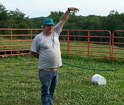 Kim and one of Buddy's stallions Prince's clay trying to get to the creep feeder |