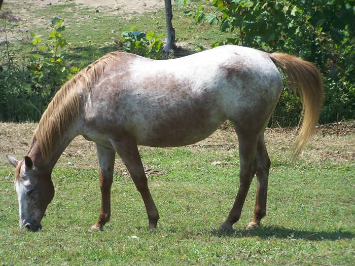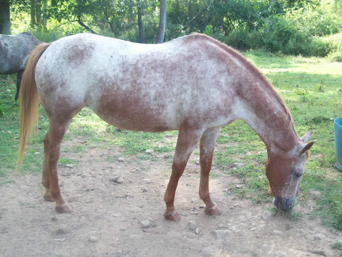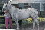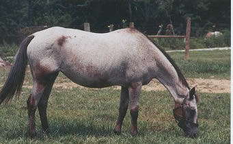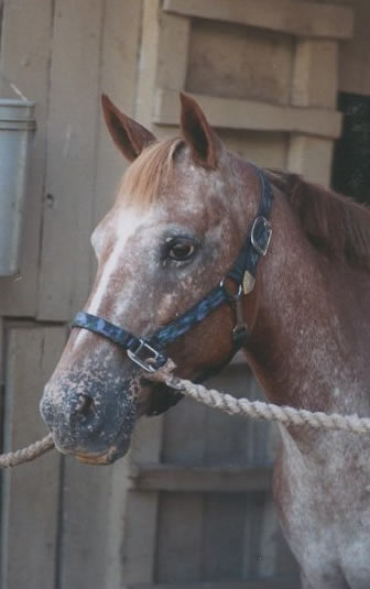 HIDDEN WATER APPALOOSAS Prince's Clay Mist Chesnut Roan with spots Foaled 1990 Registration # 507387 |